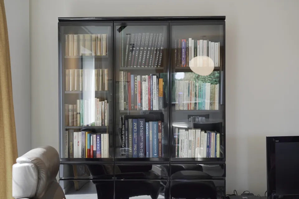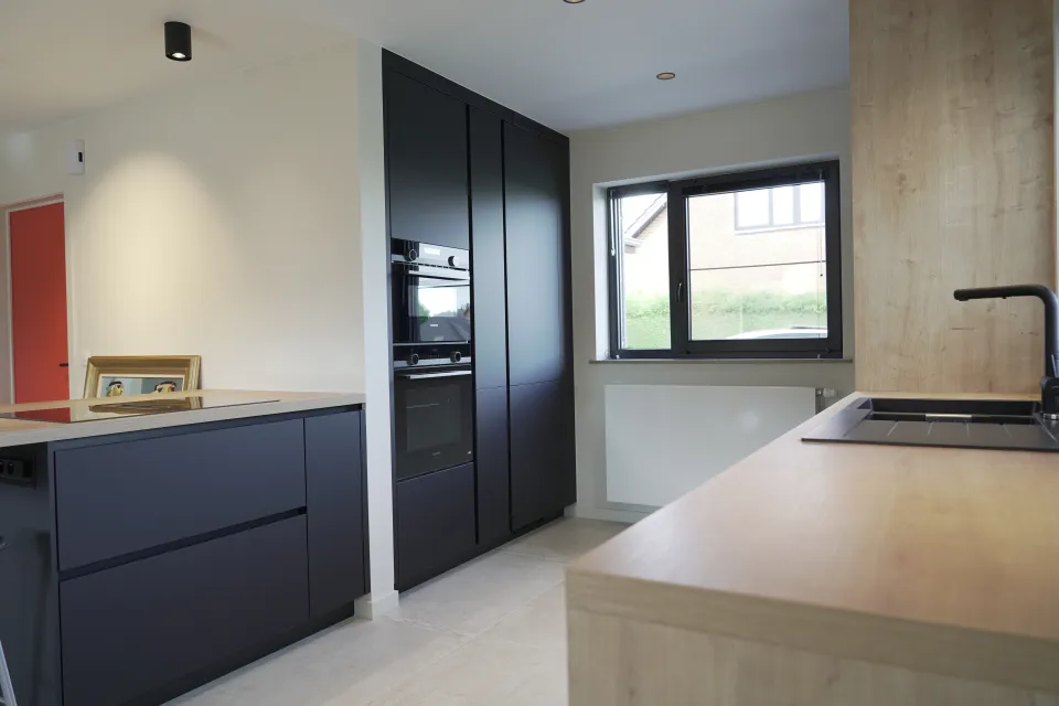 La cuisine, super équipée, de marque Eggo, est disposée de manière telle que le cuisinier fait face au salon et à la télévision mais peut aussi discuter avec les convives attablés sur des hauts tabourets autour de lui, sur le plan de travail.