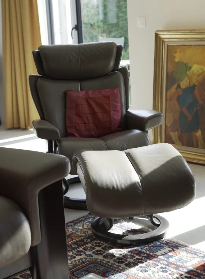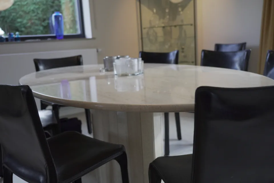 Une grande table en travertin peut accueillir jusqu'à 8 personnes. Le salon équipé de fauteuils StressLess garantit le repos pour lire, regarder la TV et échanger avec les amis.