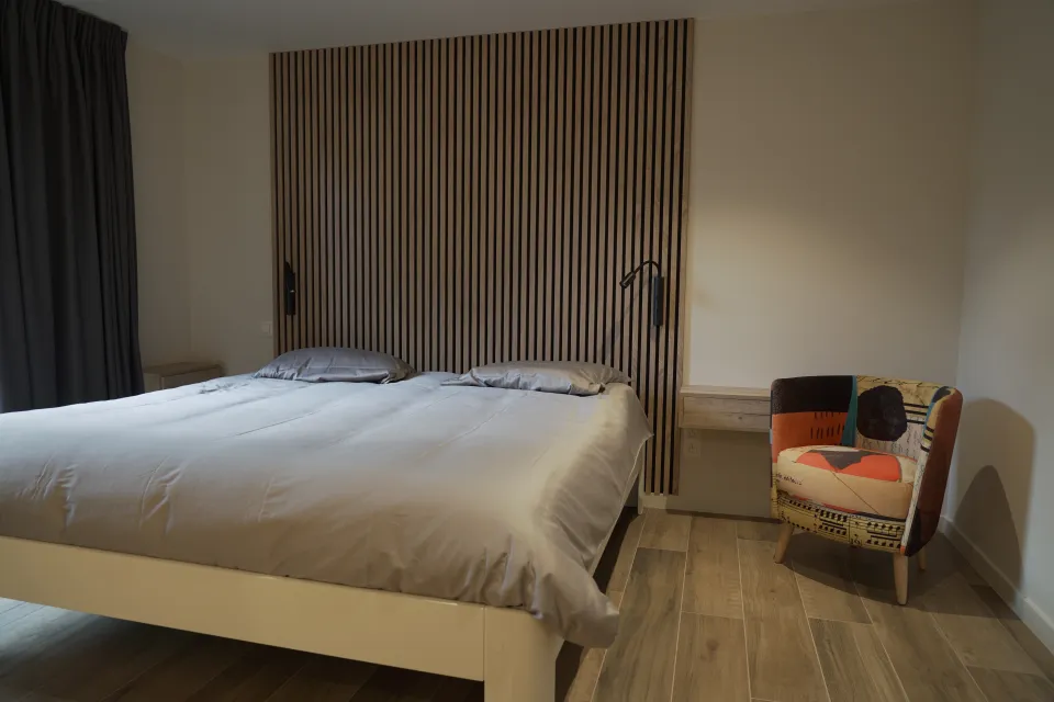 La chambre parentale est équipée d'un lit (1.80 x 2.00 m), de literie de haut standing de la marque Auping. Deux tables de nuit sont chacune surmontées d'une lampe liseuse dimmable avec ports USB et USB-C. Un fauteuil "crapaud" complète l'équipement.